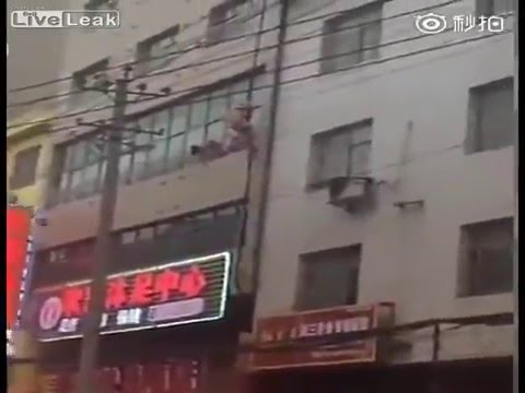 Un video publicado en YouTube, muestra los momentos en que el amante de una mujer intenta huir por el balcón de un hotel en China, cuando son descubiertos por el esposo.