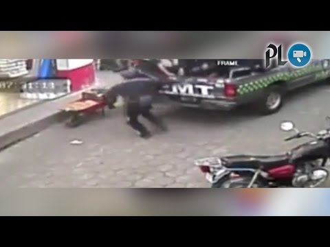 Agentes de PM de San Pedro Sacatepéquez, San Marcos, decomisan producto de un vendedor en una de las calles del poblado. (Video Prensa Libre: Aroldo Marroquín).