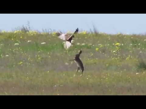 Un conejo se enfrentó contra un halcón en un campo abierto en Rusia.
