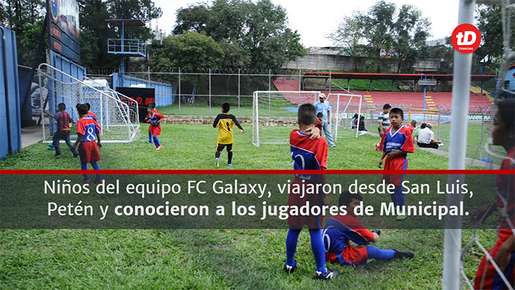 Niños del equipo FC Galaxy, viajaron desde San Luis, Petén e hicieron realidad su sueño de conocer y compartir con los jugadores de Municipal, este jueves en el estadio El Trébol.