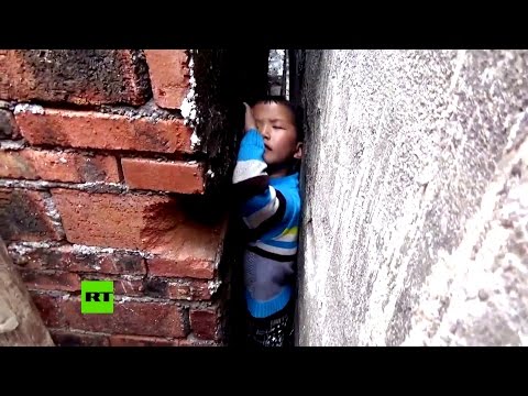 Bomberos de la ciudad china de Shaoyang, en la provincia de Hunan, rescataron a un menor que había quedado atrapado en el reducido espacio que había entre dos casas.
