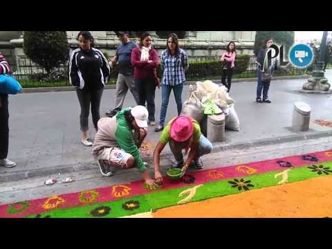 Miles de guatemaltecos se unieron este Jueves Santo en el Paseo de la Sexta, en el Centro Histórico de la capital, para elaborar una alfombra de aserrín considerada la más grande del mundo.