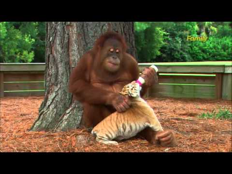 Increíbles imágenes de orangután alimentando a unos tigres cachorros.