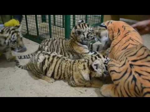 Para salvar a tres cachorros de tigre, huérfanos de madre, un parque del centro de India recurrió a un felino de plástico en el que colocó biberones con leche.
