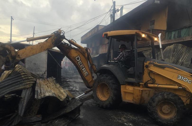 Socorristas de diversas compañías trabajan juntos en el descombramiento del mercado de artesanías de Esquipulas, para evitar que el incendio se reactive. Policía custodia el área para evitar robos.