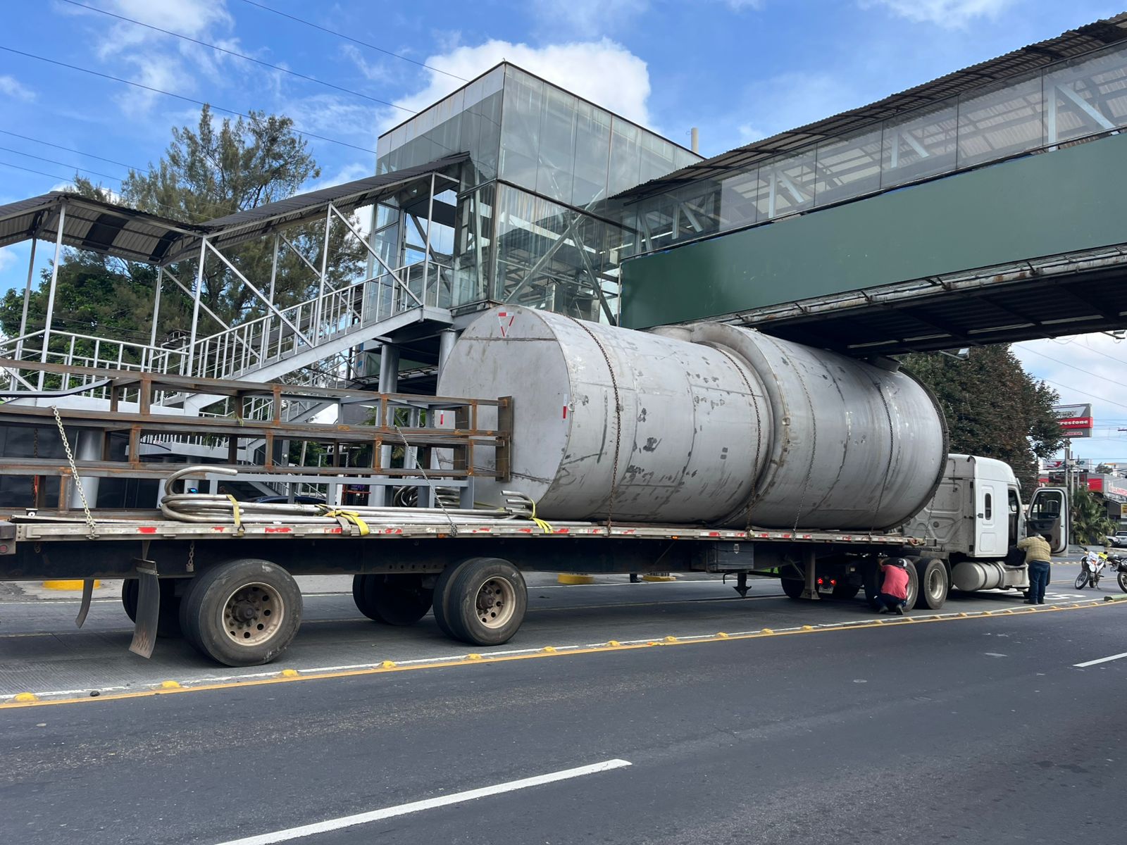 La unidad transporta un cilindro de grandes dimensiones que excede la altura permitida para las pasarelas de la capital. El piloto y agentes de la PMT tratan de desinflar las llantas del vehículo para lograr que pase sin causar daños a la estructura.