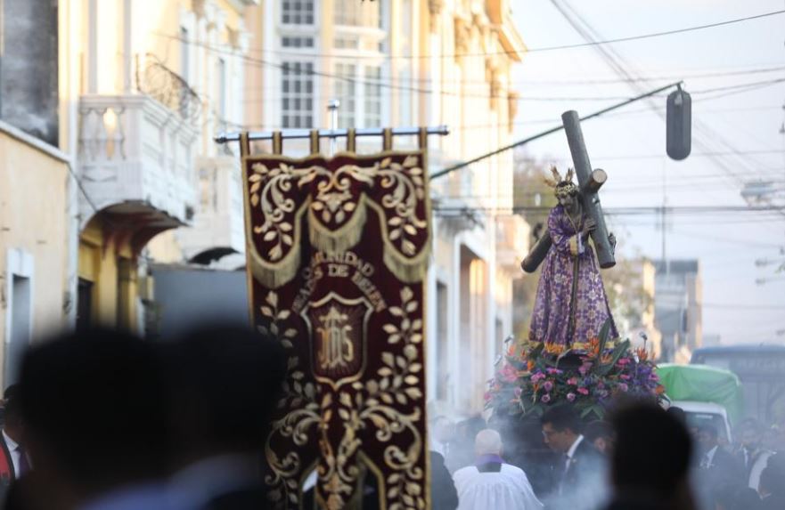 La consagrada imagen de Jesús Nazareno del Beatario de Belén en solemne procesión de traslado recorre las calles aledañas al templo de Beatas de Belén, en la zona 1 de la capital. Foto: Jorge Ordoñez