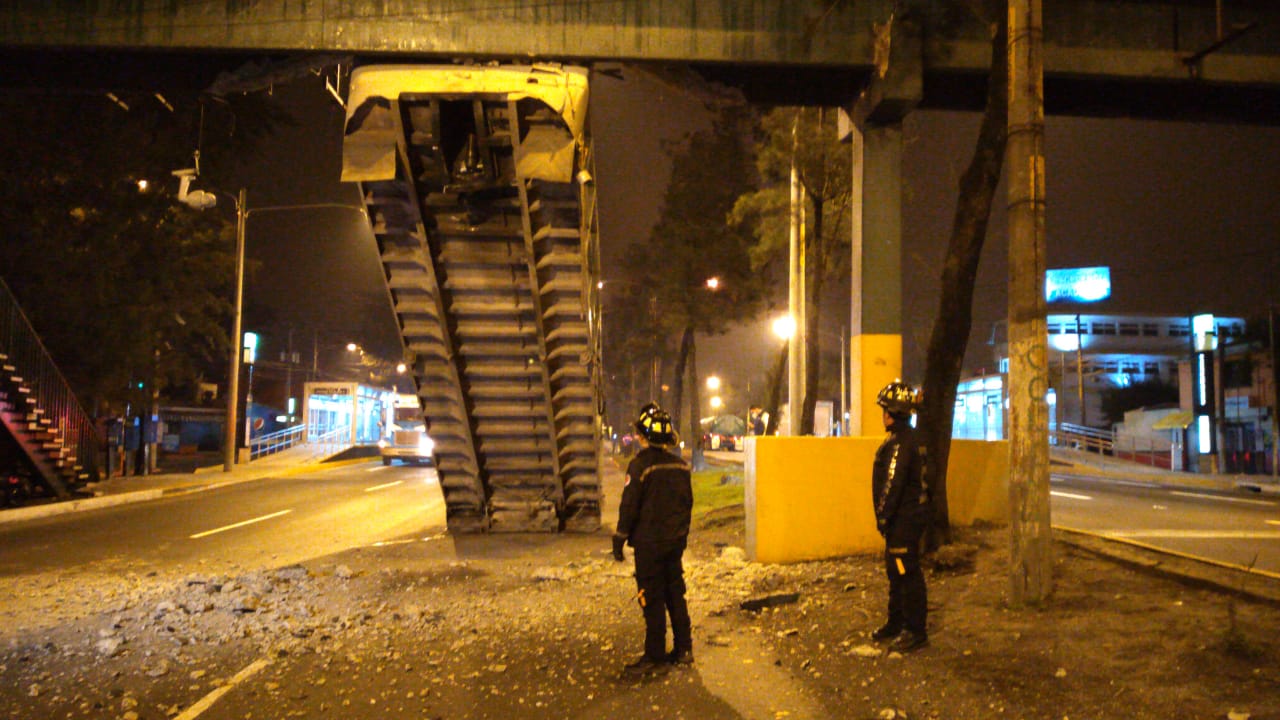 Una góndola (palangana) de un camión de volteo se quedó trabada en la pasarela ubicada en el Anillo Periférico y 13 calle de la zona 7, colonia Ciudad de Plata. Los Bomberos Voluntarios acudieron al lugar.