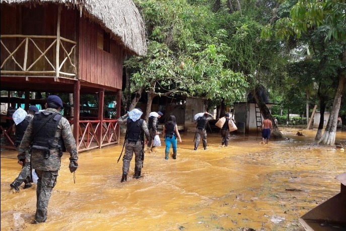 Soldados participan en ayuda humanitaria para 250 pobladores de la aldea Punta Caimanes, por el desborde del río Sumache, en Izabal.