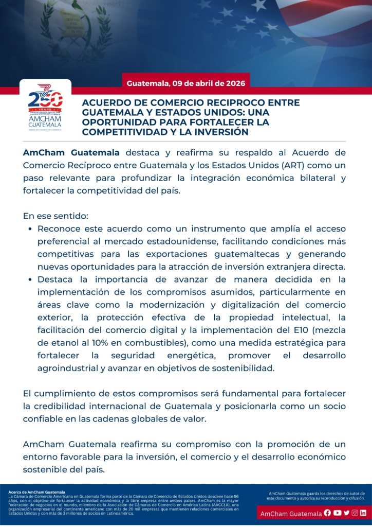 Amcham Guatemala reconoce el Acuerdo de Comercio Recíproco entre Estados Unidos y Guatemala como un instrumento para ampliar el acceso preferencial al mercado estadounidense, facilitar las exportaciones guatemaltecas y atraer inversión extranjera directa.