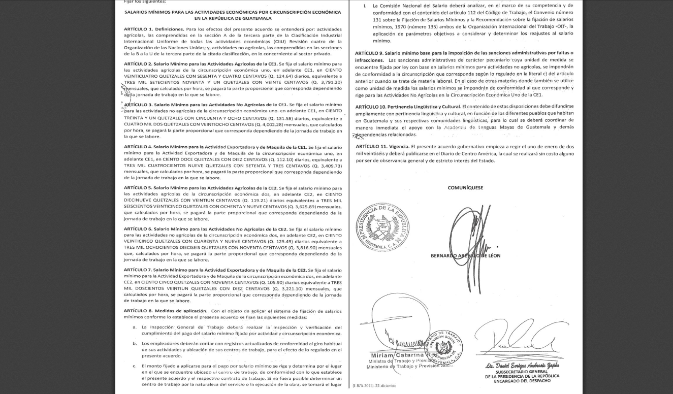 El Ministerio de Trabajo fija el salario mínimo para la actividad no agrícola en Q3,816.90 mensuales en todos los departamentos, excepto en el de Guatemala.