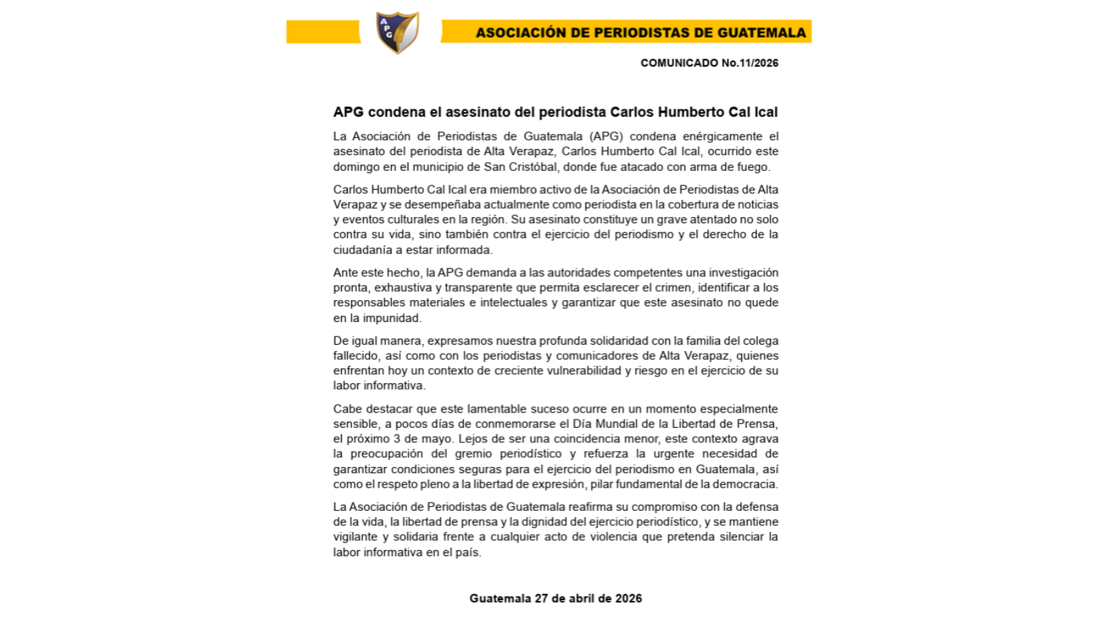 La Asociación de Periodistas de Guatemala (APG) condena el asesinato del periodista Carlos Humberto Cal Ical, ocurrido en San Cristóbal, Alta Verapaz, y exige una investigación para esclarecer el crimen.