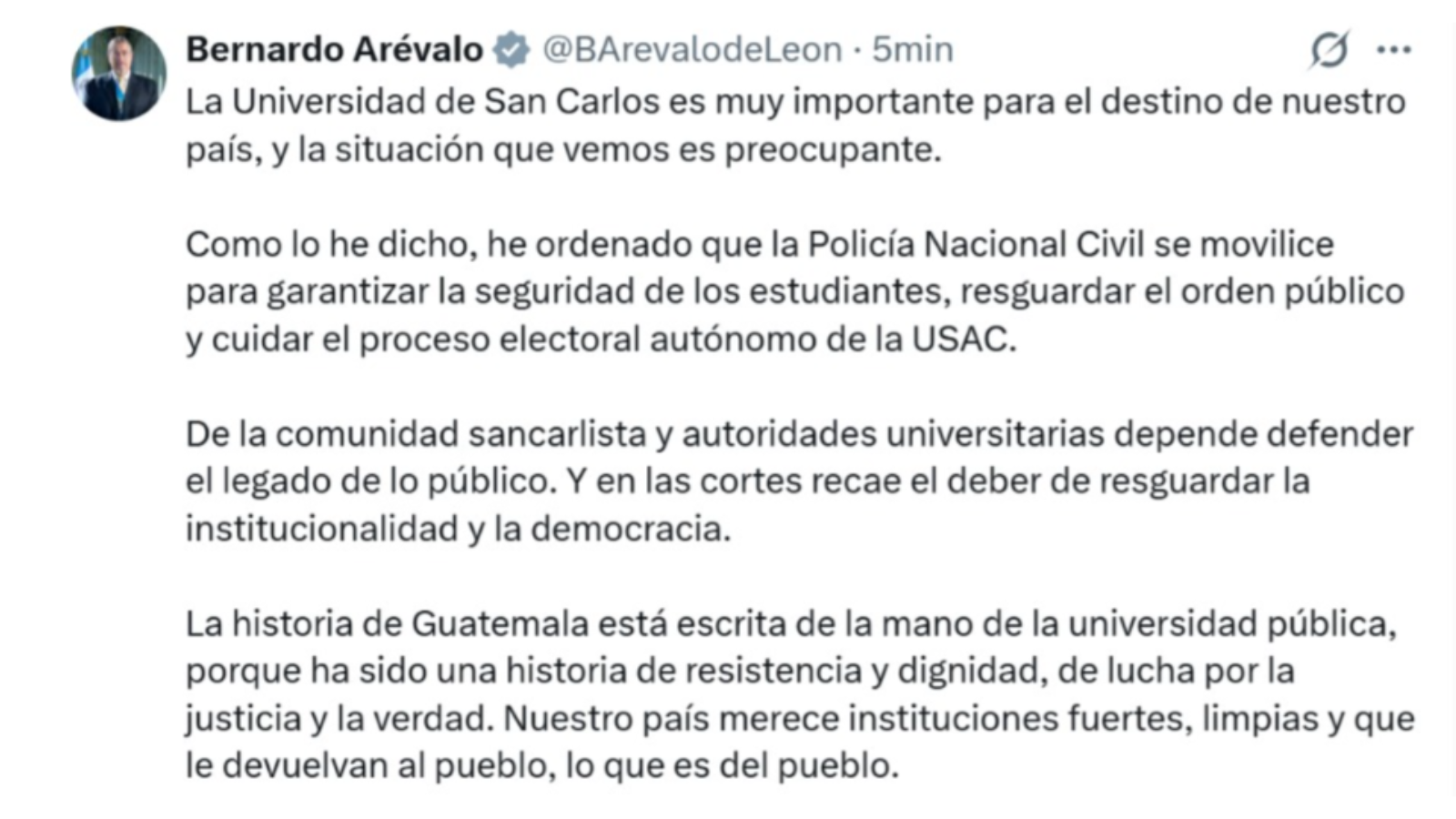 El presidente de Guatemala, Bernardo Arévalo, publica en su cuenta de X que ha ordenado la movilización de la Policía Nacional Civil para garantizar la seguridad de los estudiantes, resguardar el orden público y cuidar el proceso electoral autónomo de la Usac.