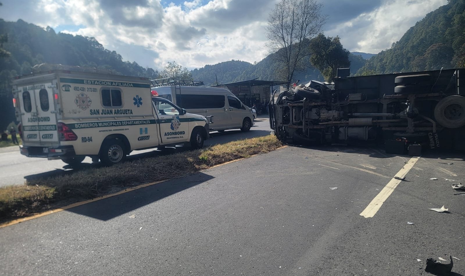 Camión afecta ambos carriles en el km 140 de la ruta Interamericana, tras colisión con otro vehículo pesado. (Foto: Prensa Libre, Bomberos Municipales Departamentales).