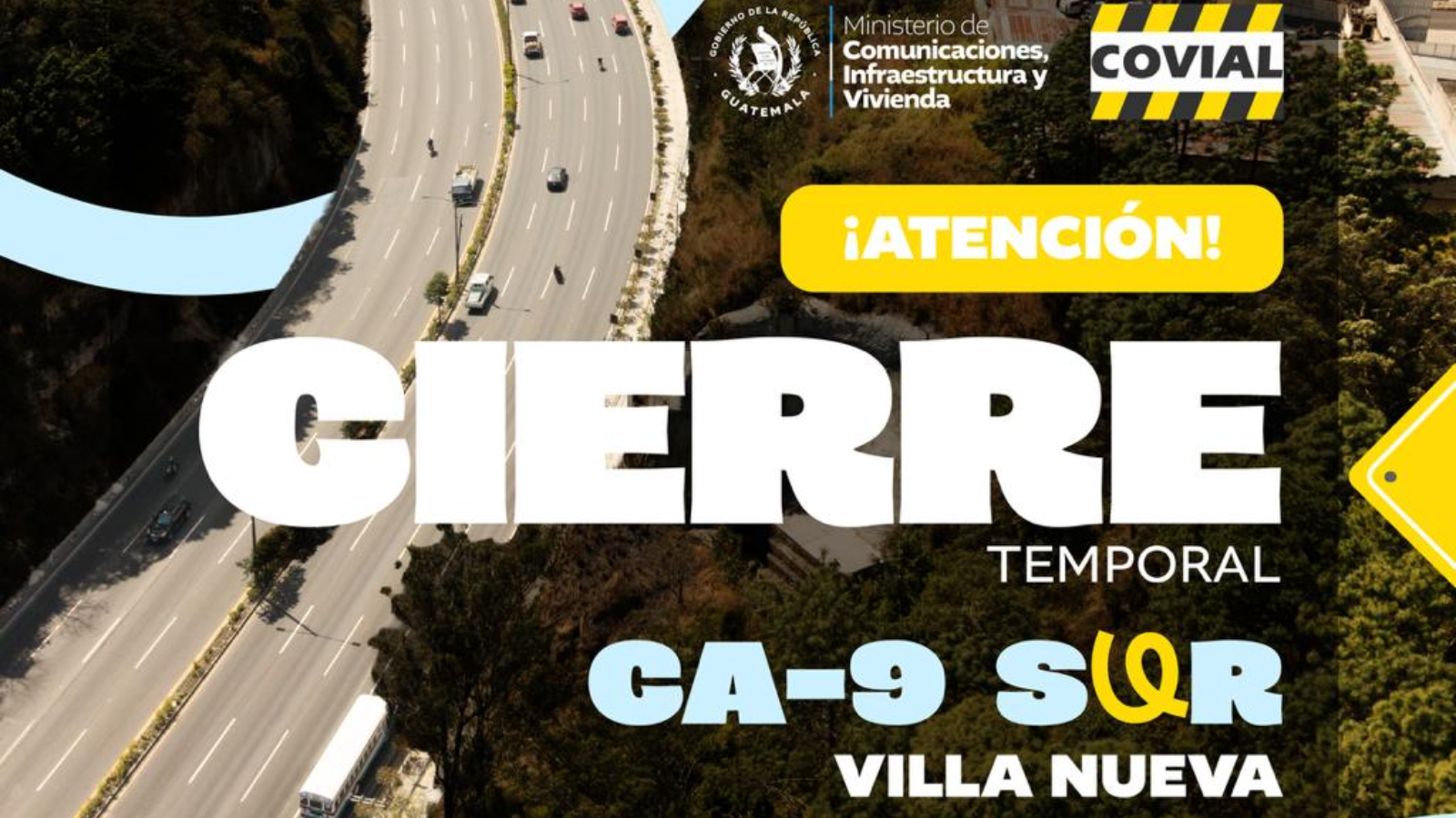 El Ministerio de Comunicaciones informa sobre el cierre temporal de un tramo de 300 metros en el carril derecho de la ruta CA-9 Sur, entre los kilómetros 14.7 y 15, en dirección a Villa Nueva.