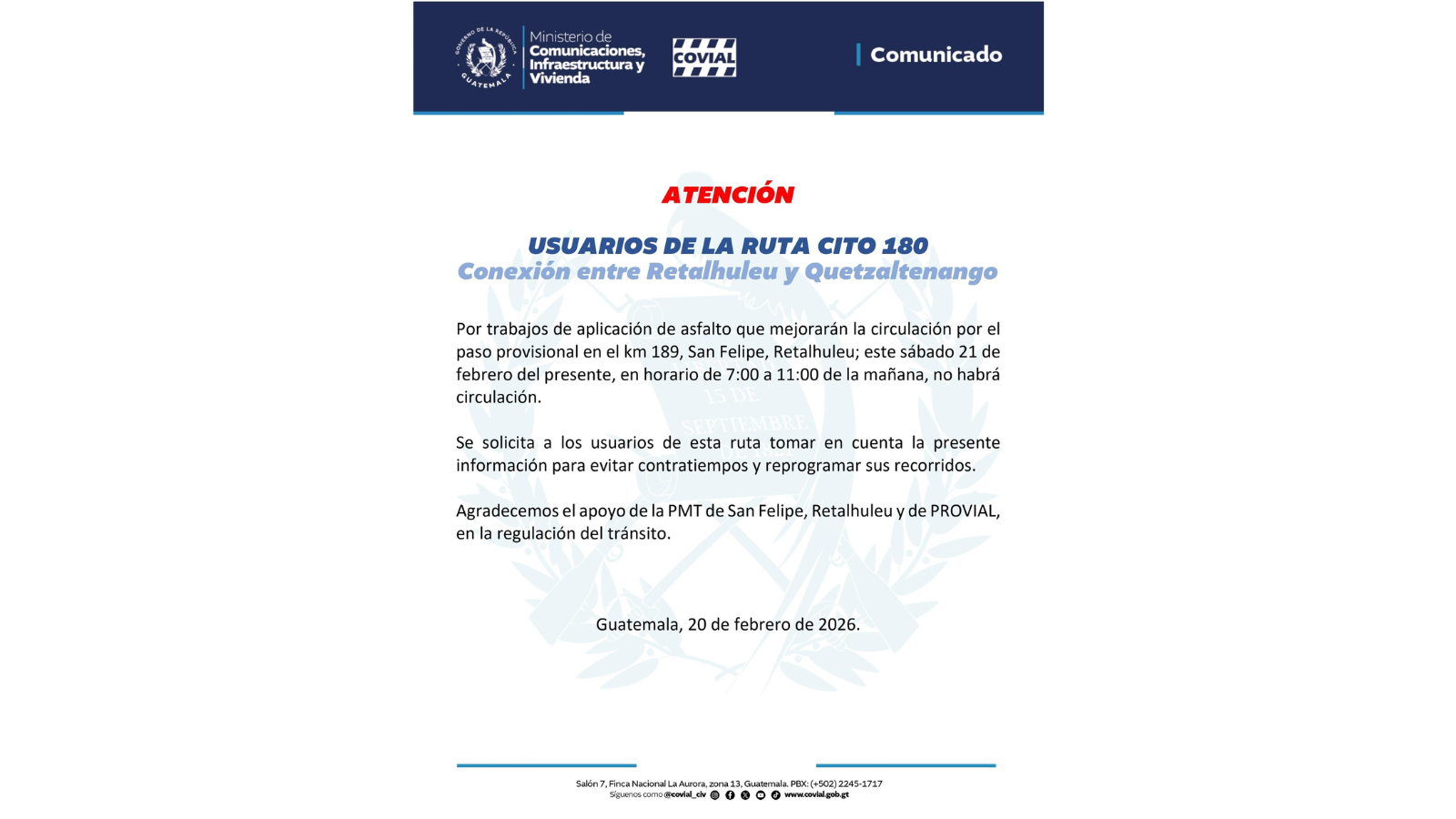 El Ministerio de Comunicaciones, por medio de COVIAL, informa que este sábado 21 de febrero se aplicará una capa de asfalto en el paso provisional del kilómetro 189 de la ruta CITO-180, en San Felipe, Retalhuleu. Durante los trabajos, la circulación estará cerrada de 7.00 a 11.00 horas.