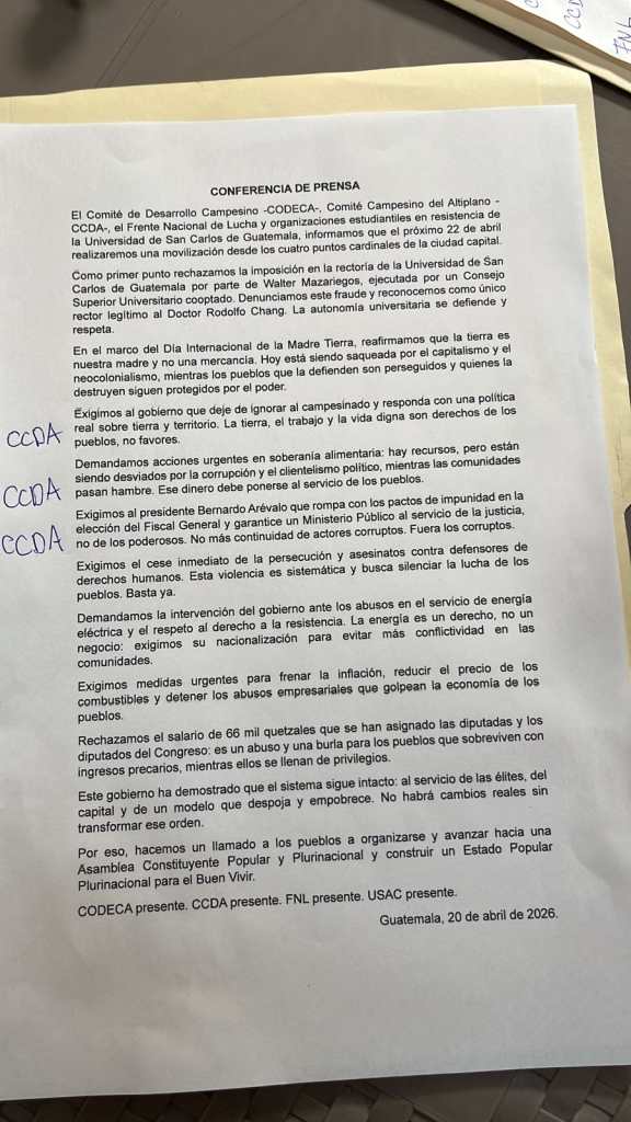 El Comité Campesino del Altiplano (CCDA), el Comité de Desarrollo Campesino y organizaciones estudiantiles piden al presidente Bernardo Arévalo romper “los pactos de impunidad” en la elección de fiscal general.
