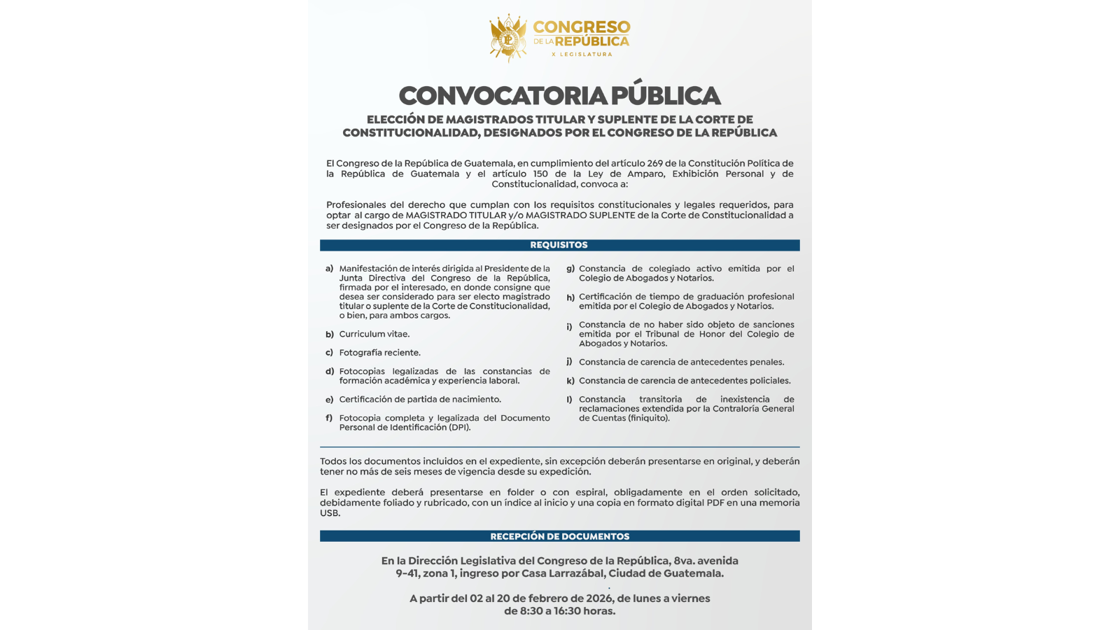 La recepción de expedientes se realizará del 2 al 20 de febrero del 2026, de 8.30 a 16.30 horas, en la Dirección Legislativa del Congreso, 8a. avenida 9-41, zona 1, ingreso por Casa Larrazábal, Ciudad de Guatemala.
