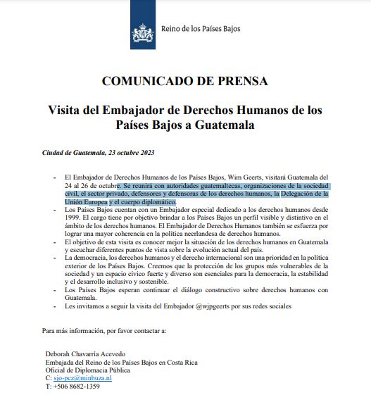También indica que el principal motivo de la visita del embajador Geerts, es para “conocer mejor la situación de los derechos humanos en Guatemala y escuchar diferentes puntos de vista sobre la evolución actual del país”.