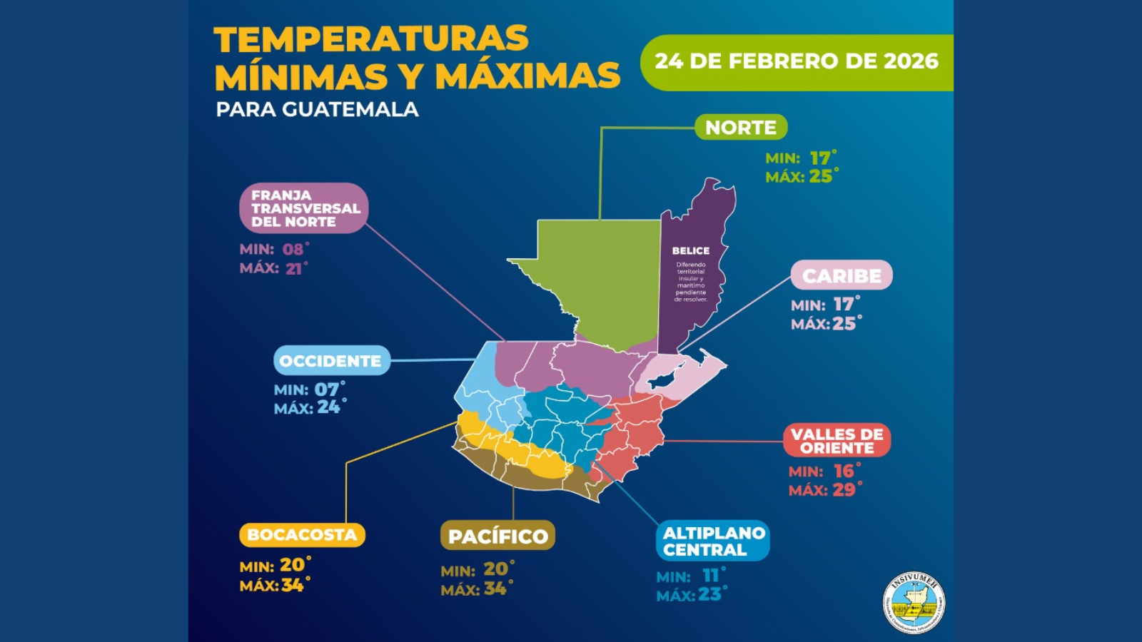 El Insivumeh prevé ambiente frío durante la noche y madrugada en el Altiplano Central, donde las temperaturas oscilarán entre 11 °C y 23 °C, mientras que en la Franja Transversal del Norte se esperan mínimas de 8 °C y máximas de 21 °C.