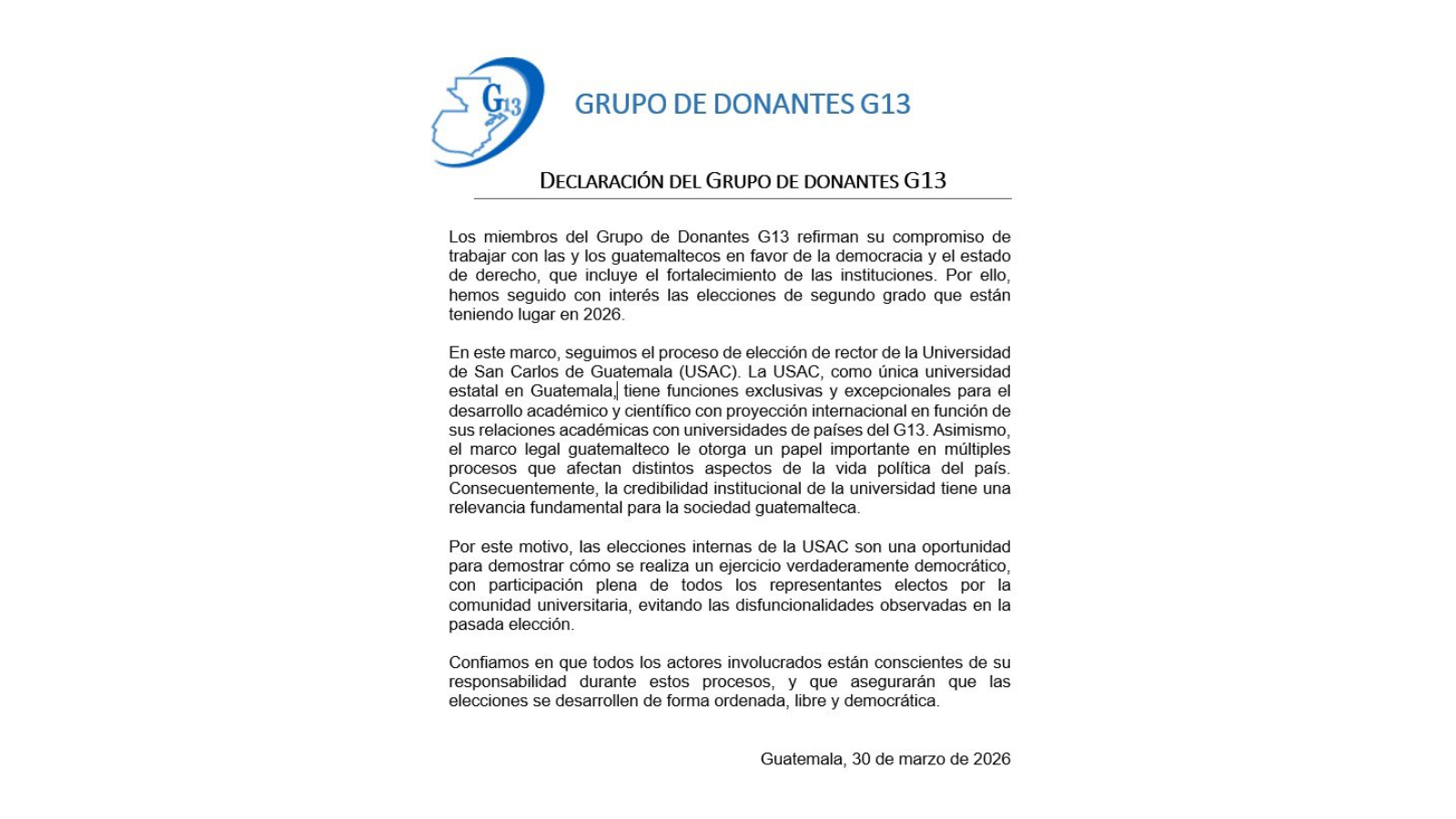 Grupo de Donantes G13 pide garantizar elecciones transparentes y sin irregularidades en la Usac