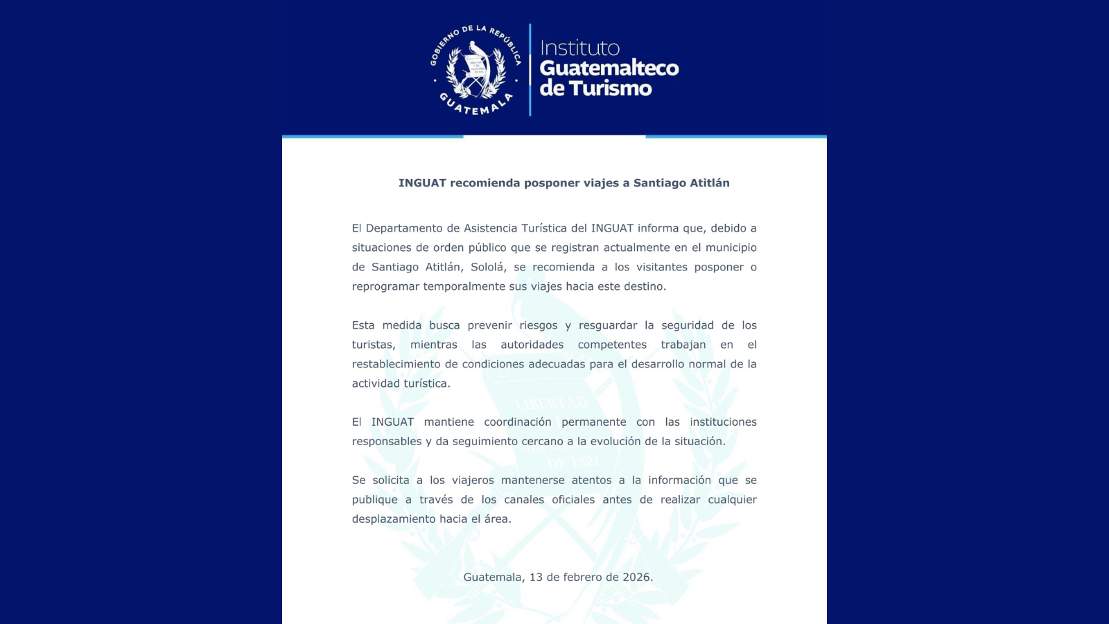 El Instituto Guatemalteco de Turismo (INGUAT) pidió a turistas nacionales y extranjeros evitar por ahora los viajes hacia Santiago Atitlán, Sololá. La institución señala que la recomendación responde a la situación de orden público en el municipio y busca proteger la integridad de los visitantes, mientras se mantiene la coordinación con otras entidades responsables.