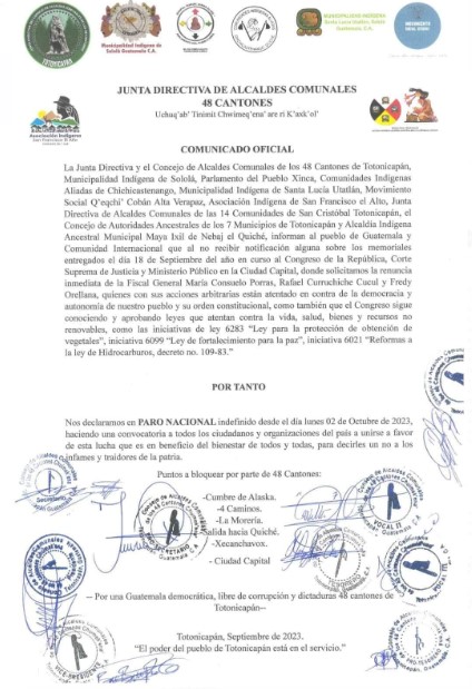 La Junta Directiva de los 48 Cantones emitió un comunicado en el que convoca a un paro nacional a partir del próximo lunes, debido a las últimas acciones emprendidas por el Ministerio Público contra el Tribunal Supremo Electoral.