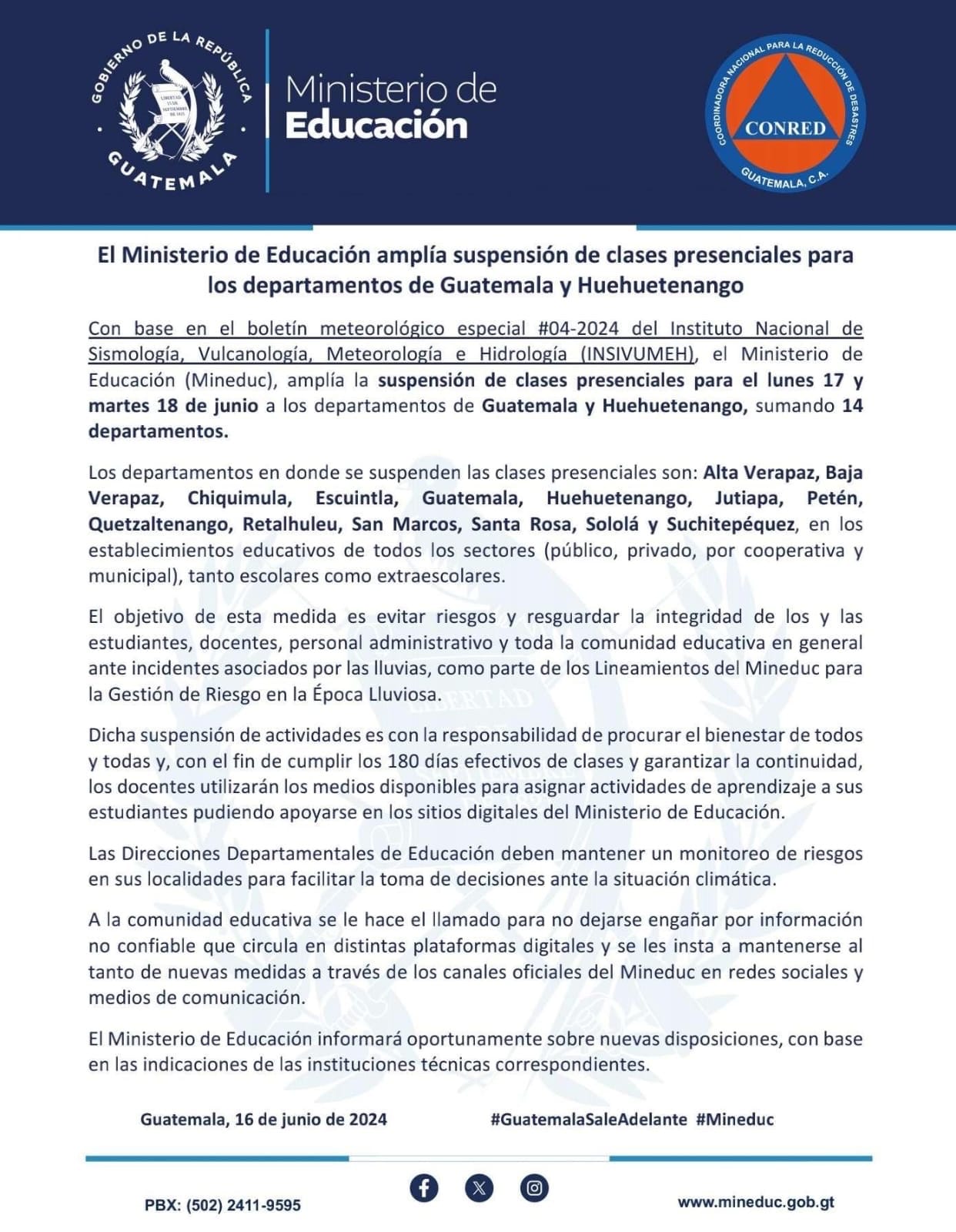 El Ministerio de Educación (Mineduc), amplía la suspensión de clases presenciales para el lunes 17 y martes 18 de junio a los departamentos de Guatemala y Huehuetenango, sumando 14 departamentos. Esto debido a las alertas que ha emitido el Insivumeh y la Conred.