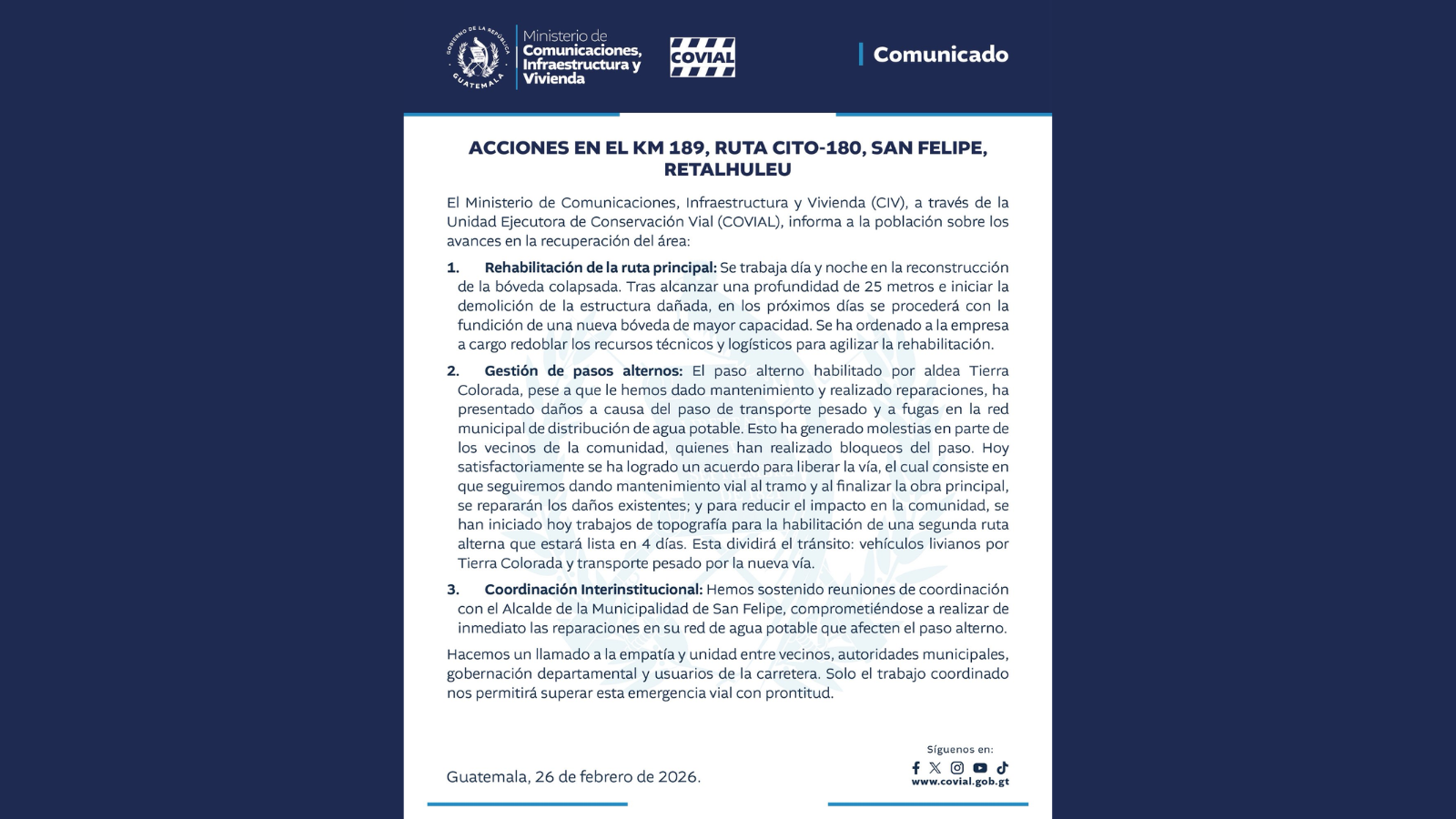 El CIV, por medio de COVIAL, informa que mantiene trabajos día y noche en el km 189 de la ruta CITO-180, en San Felipe, Retalhuleu, y que gestiona dos pasos alternos para sostener el tránsito mientras avanza la obra.