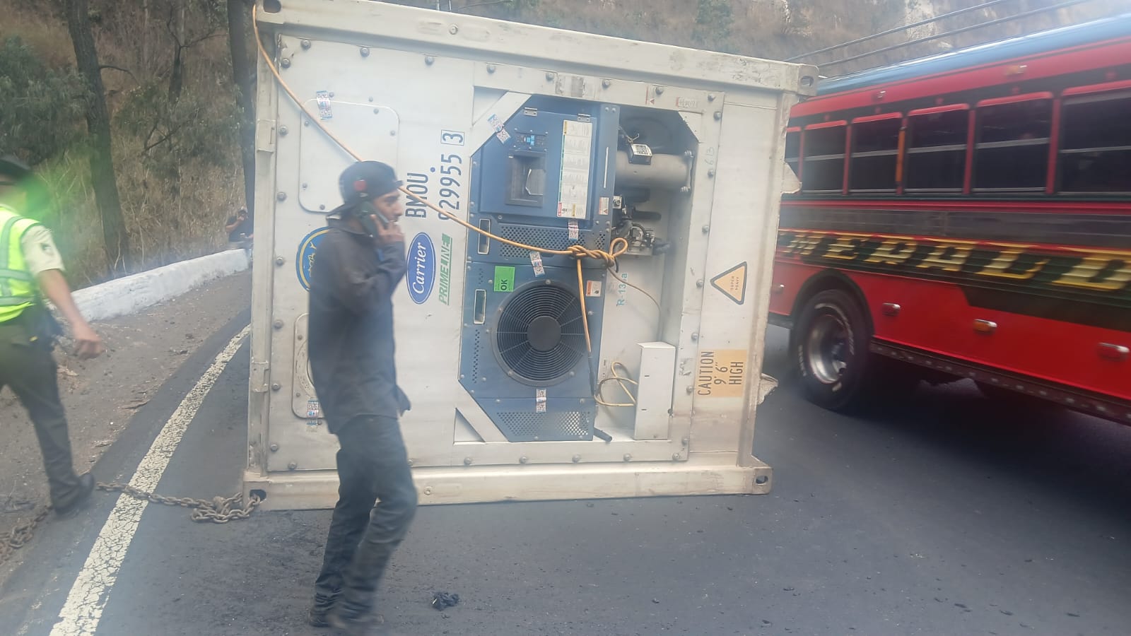 La Policía Municipal de Tránsito de Villa Nueva informa que el contenedor cae sobre la vía pública en la ruta al Pacífico, con dirección al sur, y que ya se coordinan las grúas para movilizarlo. Según la entidad, no se reportan personas heridas.