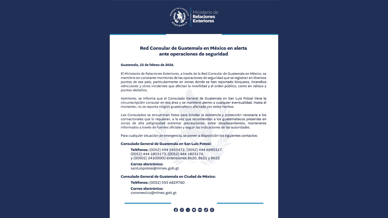 El Consulado General de Guatemala en San Luis Potosí, que tiene jurisdicción en el área afectada, permanece atento a cualquier emergencia. Hasta ahora, no se reportan guatemaltecos heridos o afectados. Los consulados están listos para brindar asistencia y piden a los connacionales evitar traslados innecesarios, mantenerse informados por canales oficiales y seguir las indicaciones de seguridad de las autoridades mexicanas.