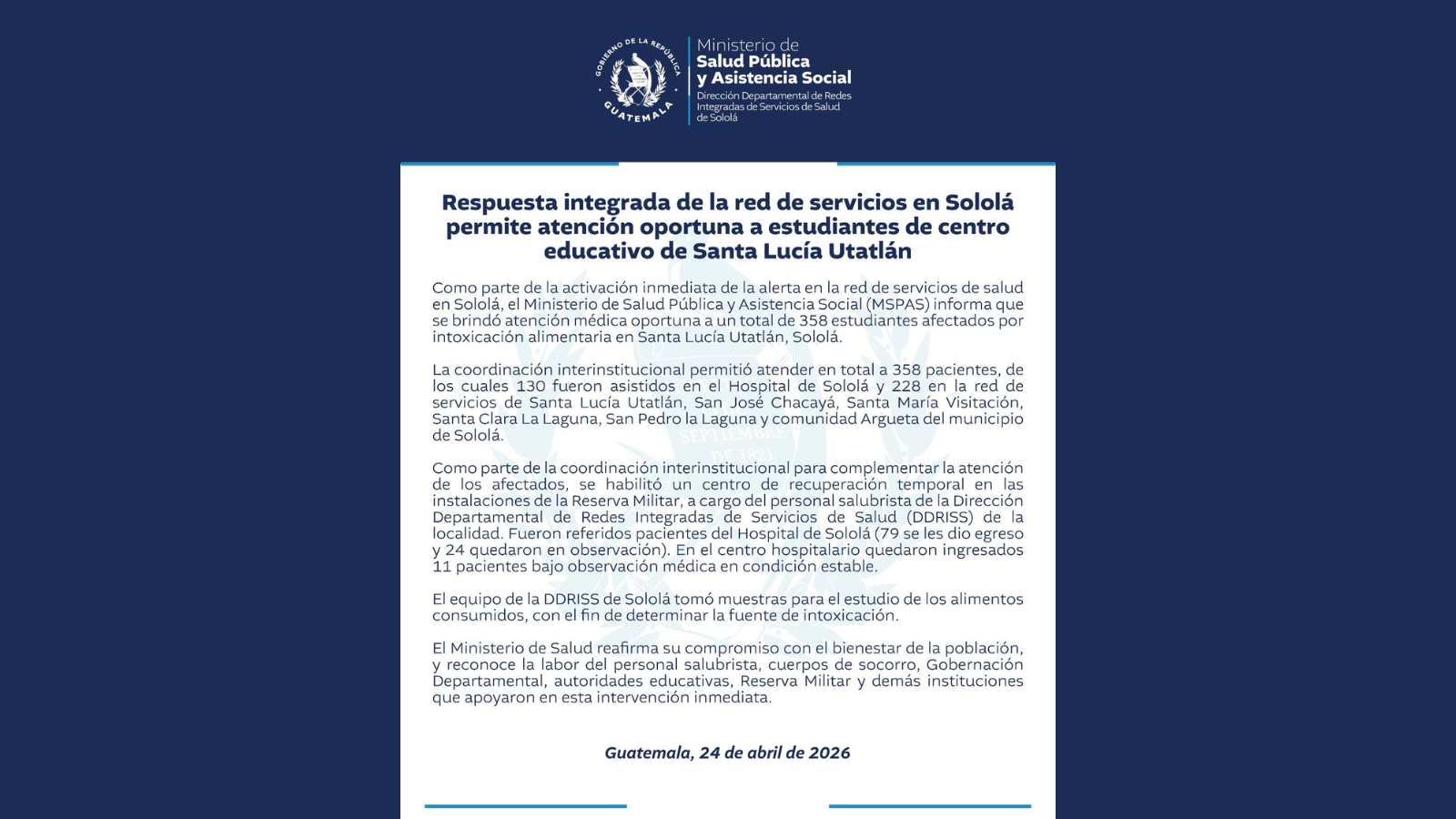 El Ministerio de Salud Pública y Asistencia Social (MSPAS) detalla que la emergencia ocurre en un centro educativo de Santa Lucía Utatlán y que la atención se brinda en el Hospital de Sololá y en la red de servicios, tras la activación institucional.