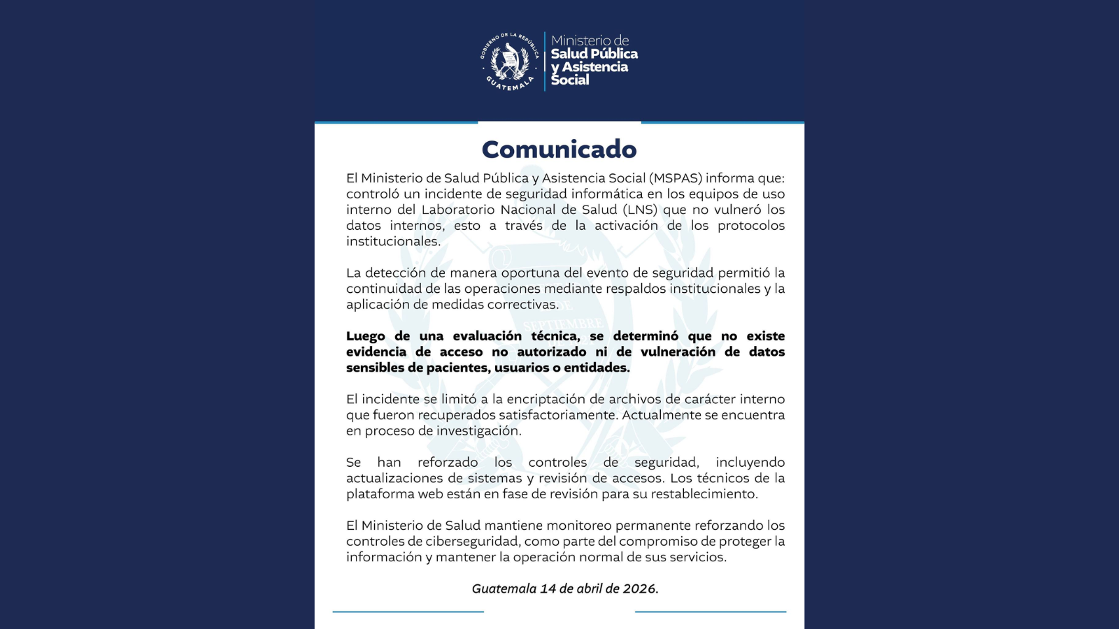El Ministerio de Salud Pública y Asistencia Social informa que controla un incidente de seguridad informática en equipos de uso interno del Laboratorio Nacional de Salud, sin evidencia de acceso no autorizado a datos de pacientes, usuarios o entidades.