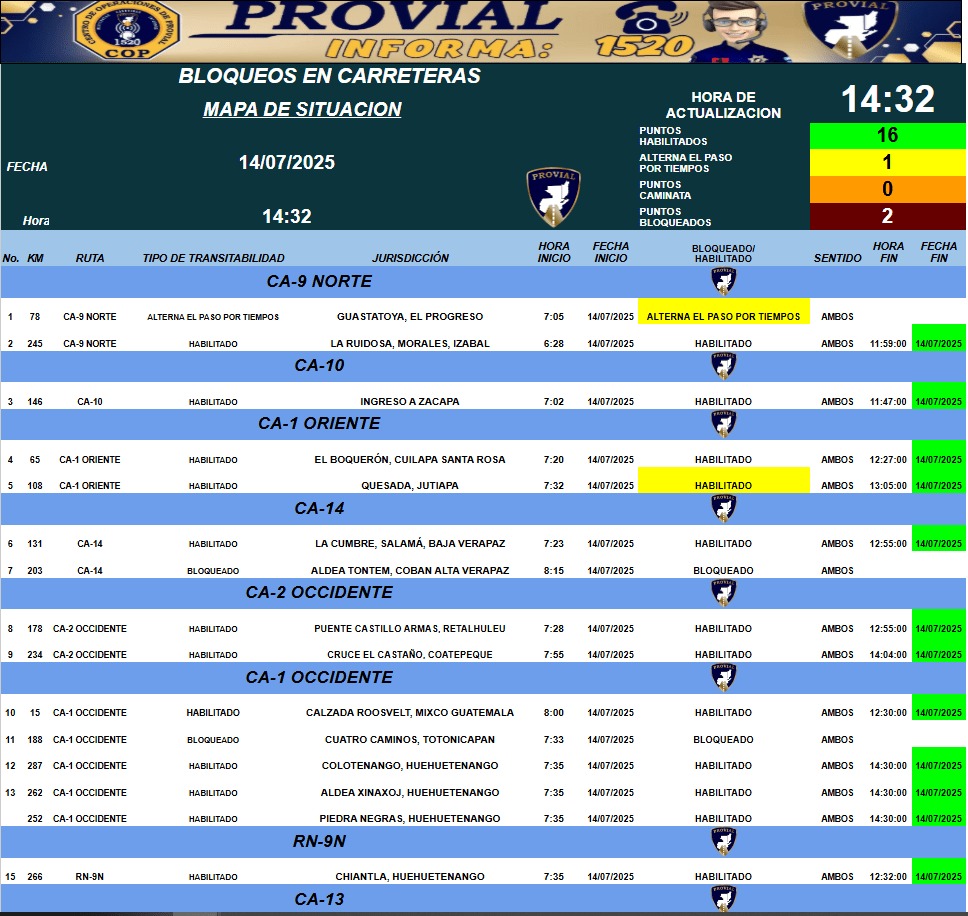 Provial informa que en el kilómetro 78 de la ruta CA-9 Norte, en Guastatoya, El Progreso, se alterna el paso vehicular en ambas direcciones.