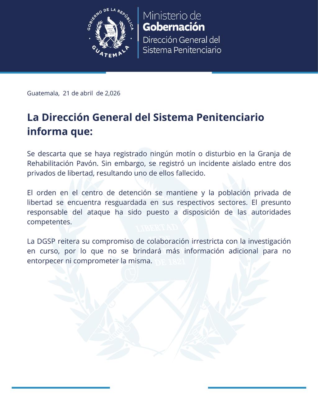 La Dirección General del Sistema Penitenciario indica que no se registra ningún motín o disturbio en Pavón, donde ocurre un incidente aislado entre dos privados de libertad que deja a uno fallecido, según el comunicado oficial.