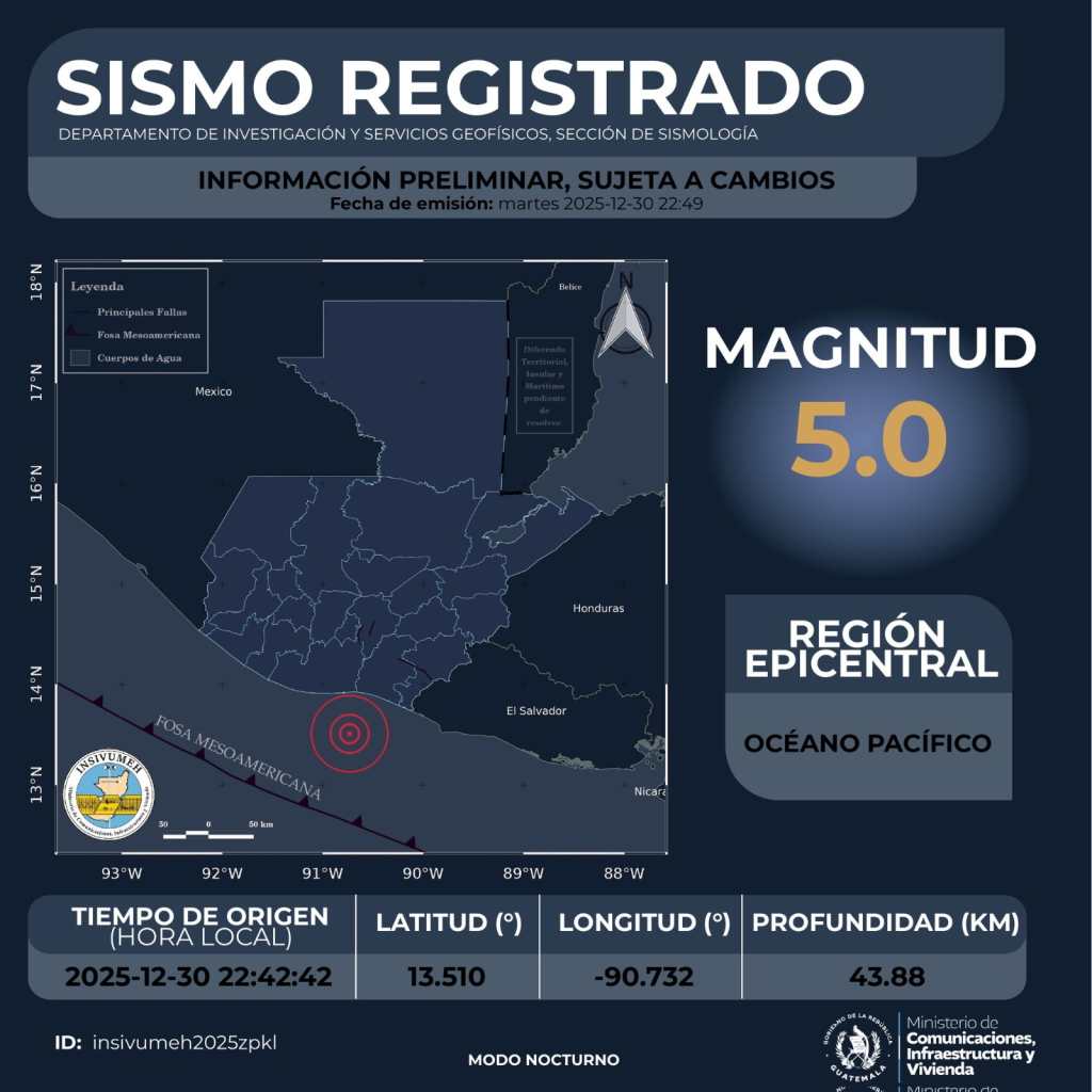 Un temblor de magnitud 5.0 se registró este lunes 30 de diciembre en el océano Pacífico, frente a las costas del sur de Guatemala, según informó el Centro de Operaciones de Emergencia (COE).
