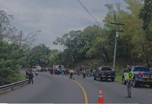 El choque de una motocicleta y un vehículo complican el tránsito en el km 91.2, en la Ruta Nacional 14, Alotenango, Sacatepéquez, informaron autoridades viales.