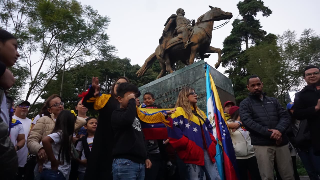 Un grupo de personas de la comunidad venezolana realiza un plantón en la plaza Venezuela, en la avenida Las Américas, una arteria icónica de la Ciudad de Guatemala; una extensión de la avenida Reforma, famosa por sus jardines, ciclovías y numerosos monumentos.
