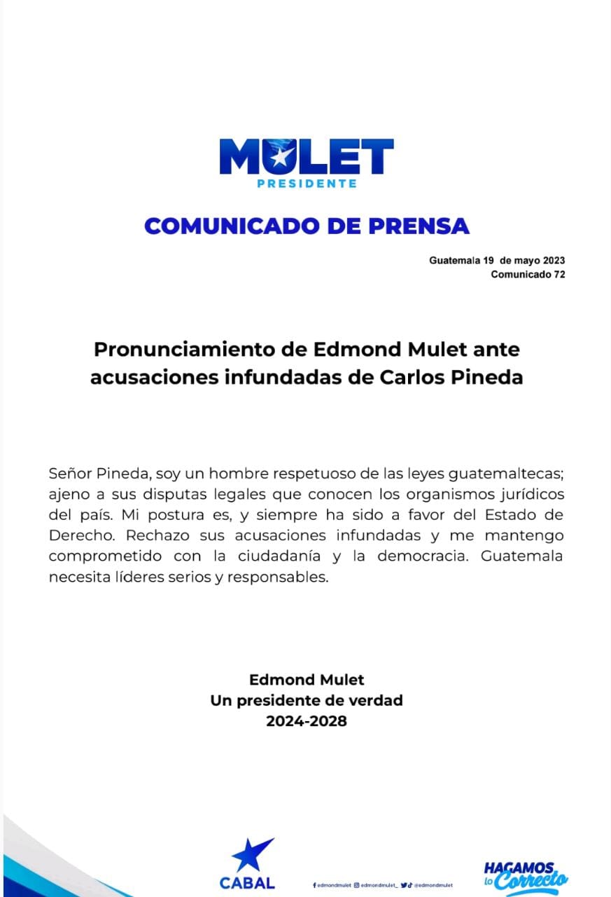 “Señor Pineda, soy un hombre respetuoso de las leyes guatemaltecas; ajeno a sus disputas legales que conocen los organismos jurídicos del país. Mi postura es, y siempre ha sido a favor del Estado de Derecho. Rechazo sus acusaciones infundadas y me mantengo comprometido con la ciudadanía y la democracia. Guatemala necesita líderes serios y responsables”, esta fue la respuesta del candidato a la presidencia Edmond Mulet, luego de que Carlos Pineda lo mencionara en video en redes sociales al enterarse que su candidatura sería suspendida por un amparo otorgado al partido Cambio.