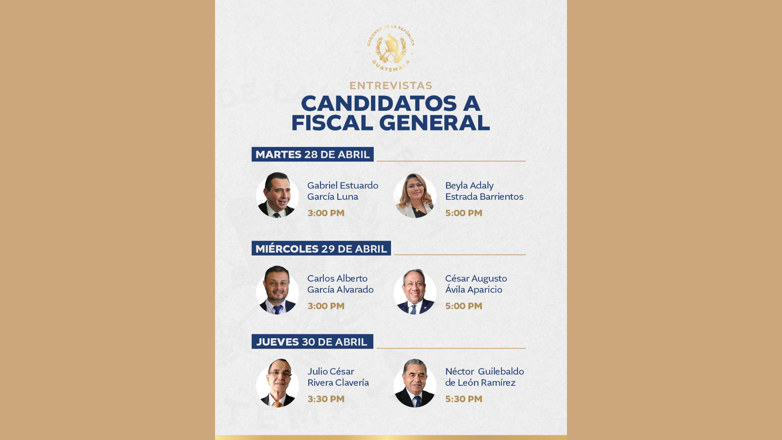 El Gobierno de Guatemala detalla fechas, horarios y orden de entrevistas a seis candidatos a fiscal general, como parte del proceso de elección del jefe del Ministerio Público.