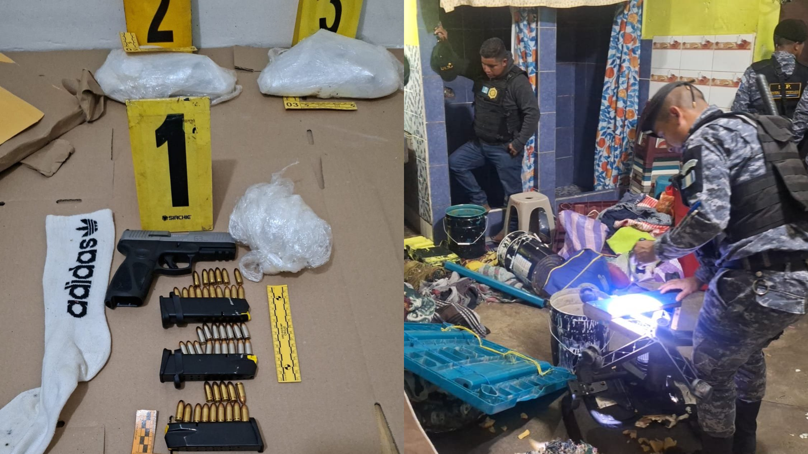 En un operativo conjunto, la Policía Nacional Civil (PNC) y personal del Sistema Penitenciario ejecutan una requisa en el Centro Preventivo para Hombres y Mujeres de Chimaltenango, donde localizan armas de fuego ocultas en el sector de aislamiento. Durante la inspección, los agentes encuentran cuatro pistolas envueltas en nylon, 12 tolvas y 188 municiones, ocultas en un agujero dentro del piso de un dormitorio.