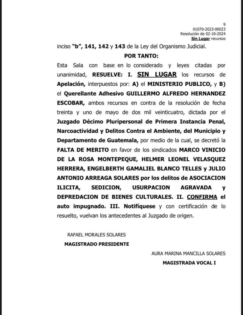 La Sala de Apelaciones sostiene la decisión del Juzgado Décimo de Instancia Penal a favor de Marco Vinicio De la Rosa, Helmer Velásquez Herrera, Engelberth Blanco Telles y Julio Arreaga Solares.