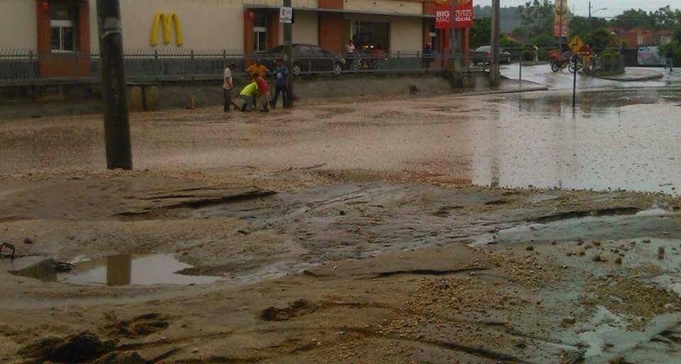 Paso vehicular cerrado por lodo en el asfalto e inundaciones a la altura del bulevar El Frutal, zona 5 de Villa Nueva.