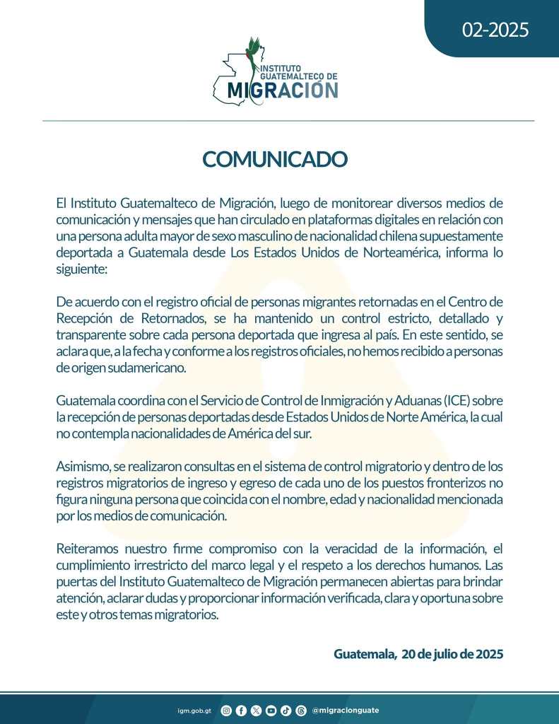 El IGM explica que Guatemala coordina con el Servicio de Control de Inmigración y Aduanas (ICE) la recepción de deportados desde Estados Unidos, lo cual no contempla nacionalidades de América del Sur.