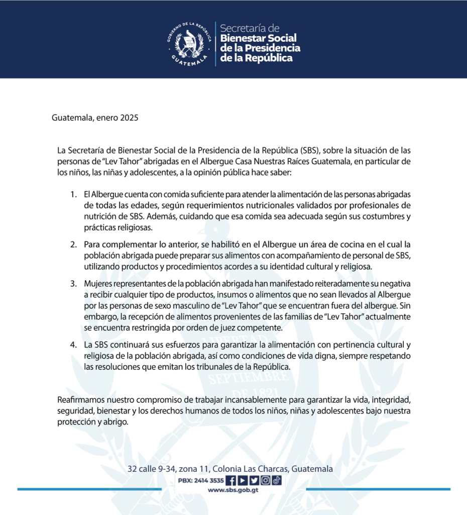 La Secretaría de Bienestar Social asegura que se cuenta con alimentos suficientes para los albergados y que son acordes a lo aceptado por su religión y comunidad. Aunque la representantes de la organización han manifestado su negativa en recibir cualquier producto.
