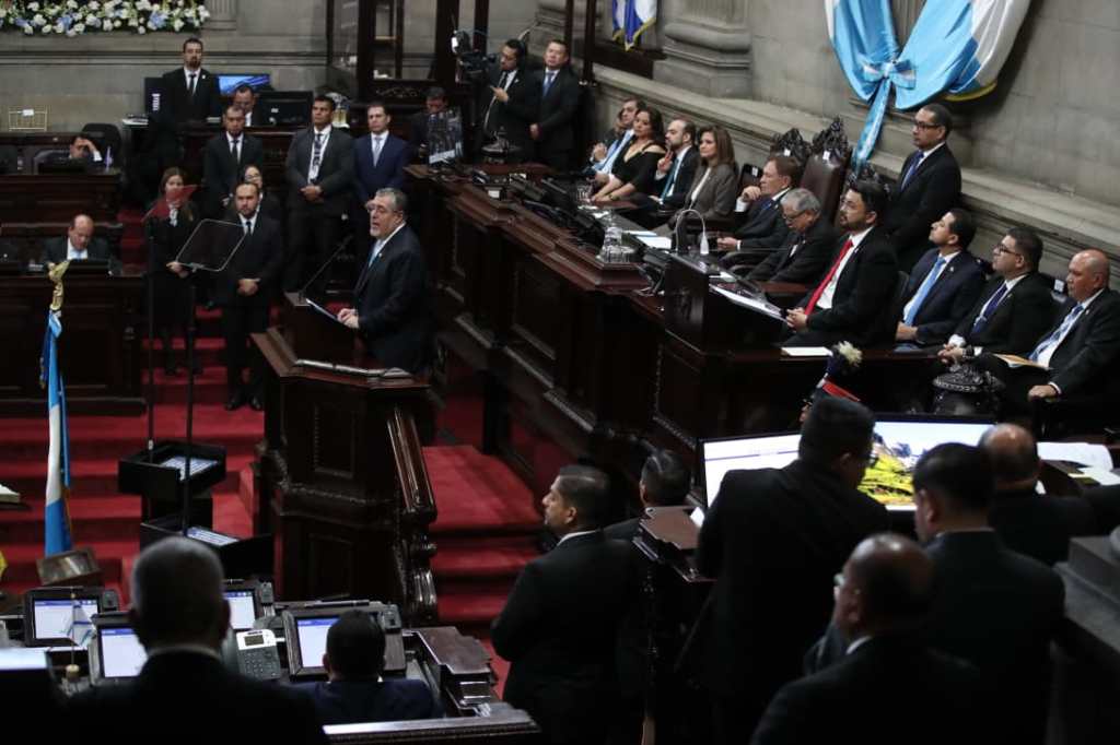 El presidente Bernardo Arévalo se retira del Hemiciclo, seguido de la vicepresidenta Karin Herrera y de los presidentes de la Corte de Constitucionalidad, la Corte Suprema de Justicia y el Tribunal Supremo Electoral.