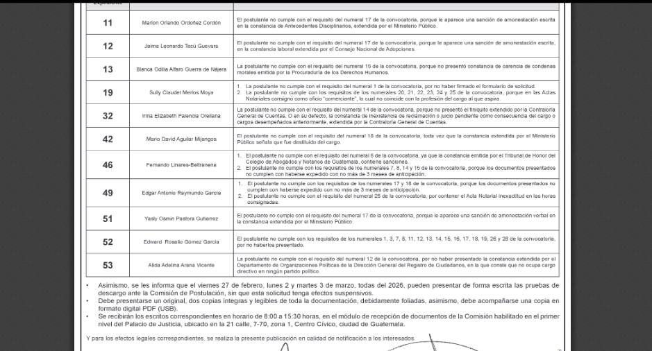 La lista de aspirantes excluidos incluye a Blanca Alfaro, Irma Palencia, Fernando Linares Beltranena y Alida Arana Vicente.