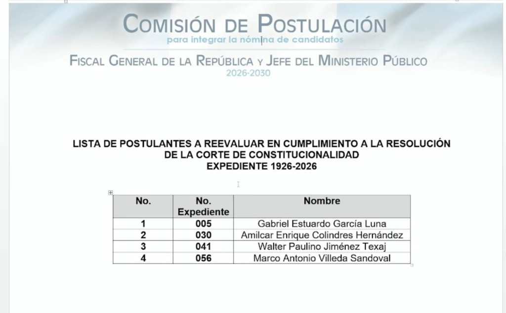Los aspirantes afectados por la resolución de la Corte de Constitucionalidad son Gabriel Estuardo García Luna, Amílcar Enrique Colindres, Walter Paulino Jiménez Texaj y Marco Antonio Villeda.