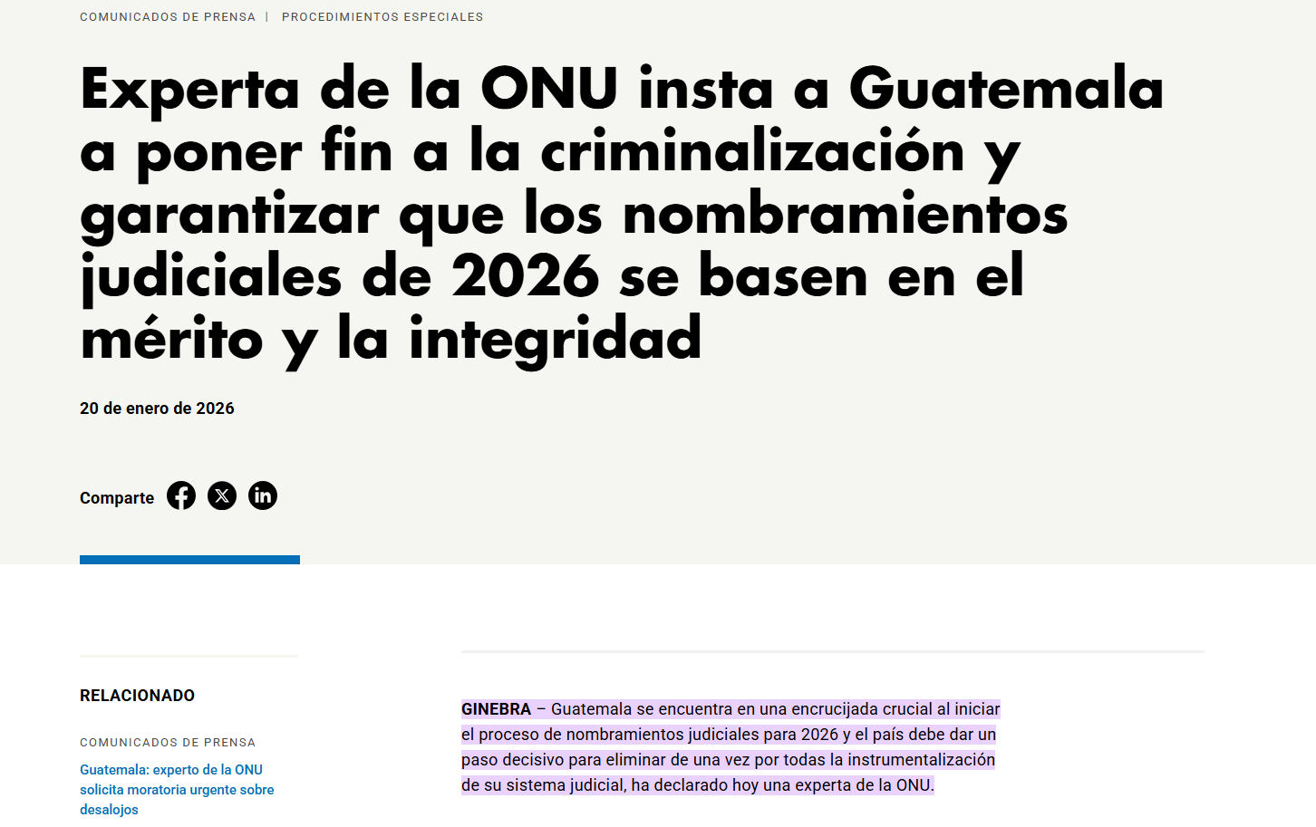 “La designación de personas de probada integridad que cumplan los requisitos para estas magistraturas esenciales sería un paso clave para poner fin a un patrón abusivo de criminalización”, indica la relatora de las Naciones Unidas para la independencia de jueces y abogados.