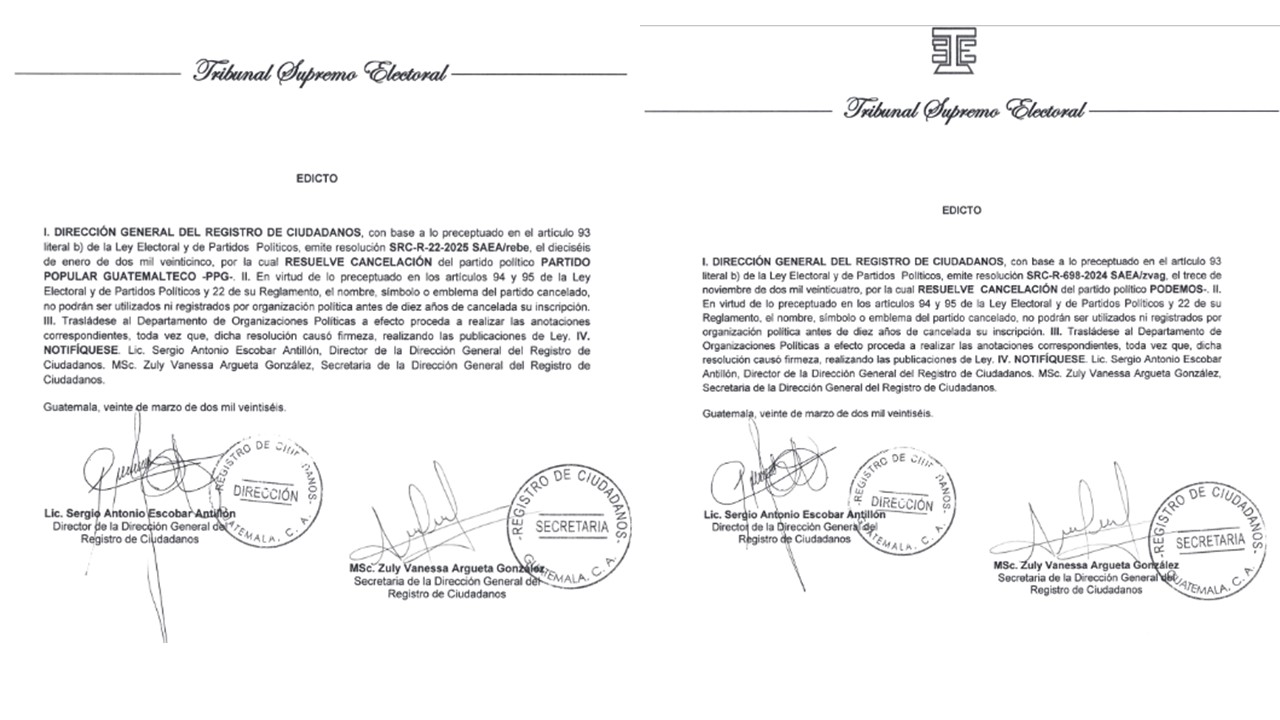 TSE resuelve cancelación del Partido Popular Guatemalteco y del partido político Podemos